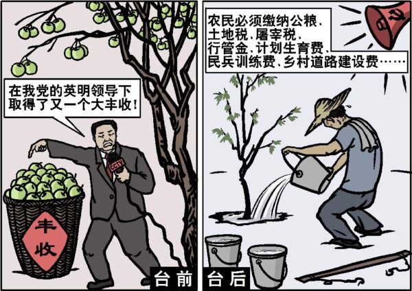 中共建政后制定了极不公正的制度:户籍制。强行划分“农业人口与非农业人口”,一个国家无端制造出两级分裂和对立。农民没有医疗保险,没有失业救济,没有退休,不能贷款。农民是中国最贫苦阶级,却也是赋税最沉重的阶级。农民要交公积金、公益金、行管金、教育费附加、计划生育费、民兵建设训练费、乡村道路建设费和优抚费。此外还要交公粮、农业税、土地税、特产税、屠宰税等等。而各种摊派更是名目繁多。而所有这些税费,“非农业人口”都不用承付。