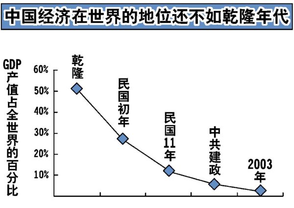中共一直在夸耀它的经济进步,实际上中国经济在世界的地位还不如乾隆年代。清朝乾隆时期,中国国内生产总值(GDP)占全世界的51%;孙中山先生创建民国初年,中国 GDP产值占全世界的27%;民国11年时,GDP仍然达到12%;中共建政时,中国的GDP占全世界的5.7%;而到2003年中国的GDP占全世界还不到4%。与国民政府时期遭遇的几十年战争引发经济下降不同,中共则基本是在和平时期引发的经济下降。